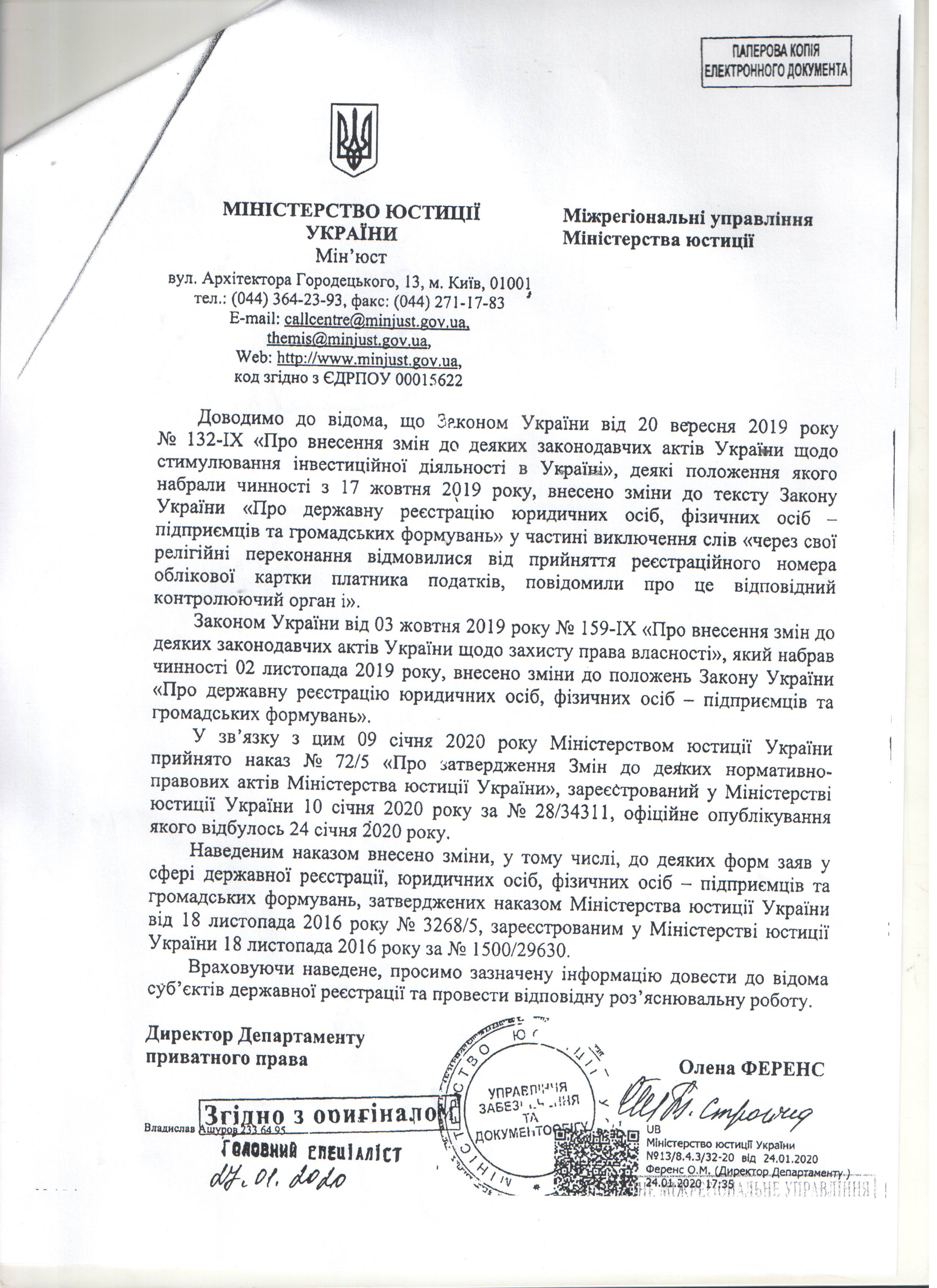 Лист Міністерства юстиції України від 24.01.2020 №13/8.4.3/32-20 щодо Наказу МЮУ "Про затвердження Змін до деяких нормативно-правових актів Міністерства юстиції України" від 09.01.2020 №72/5