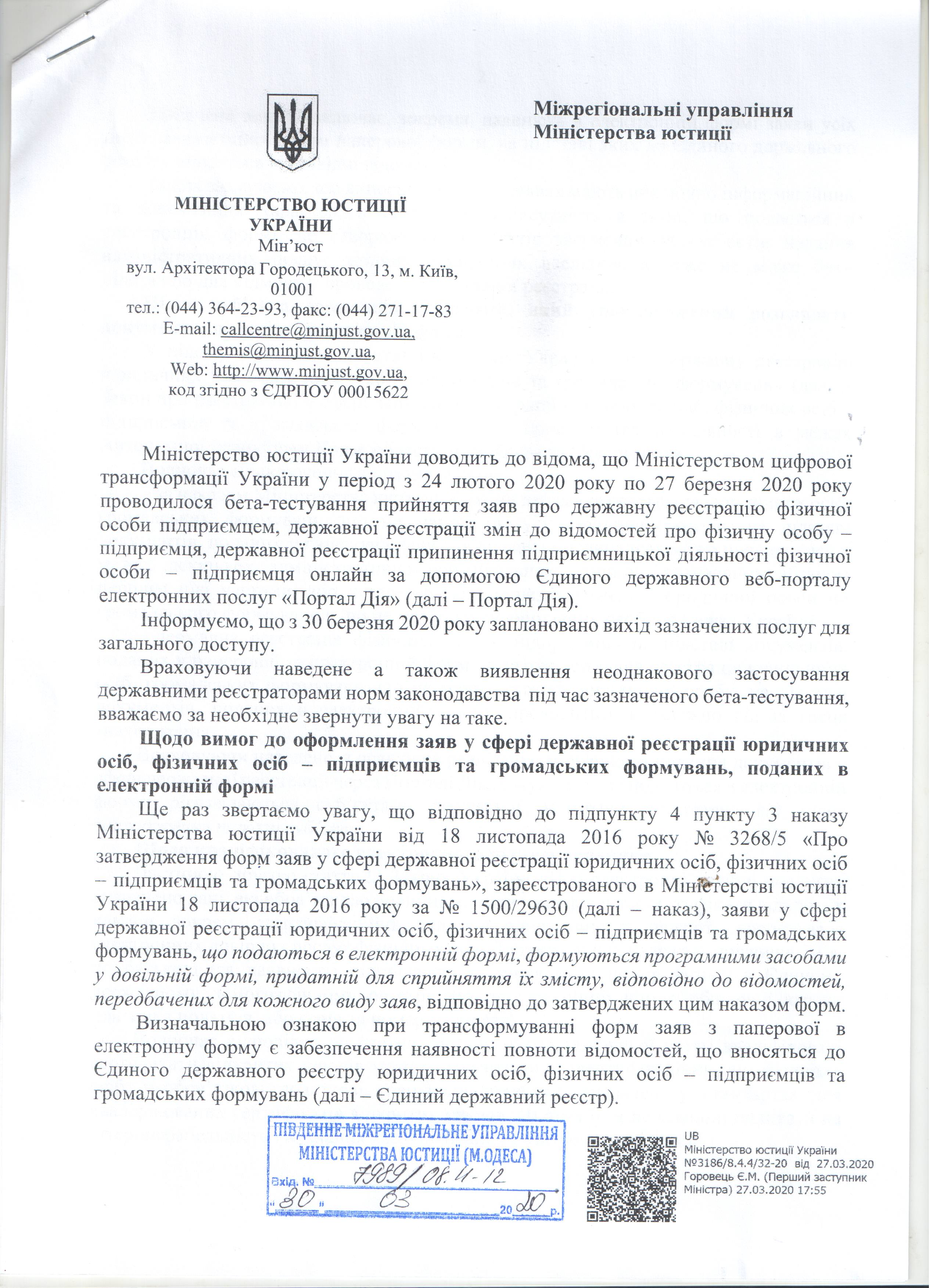Лист Міністерства юстиції України від 27.03.2020 №3186/8.4.4/32-20 щодо оформлення документів фізичної особи-підприємця онлайн за допомогою Єдиного державного веб-порталу електронних послуг "Портал Дія"