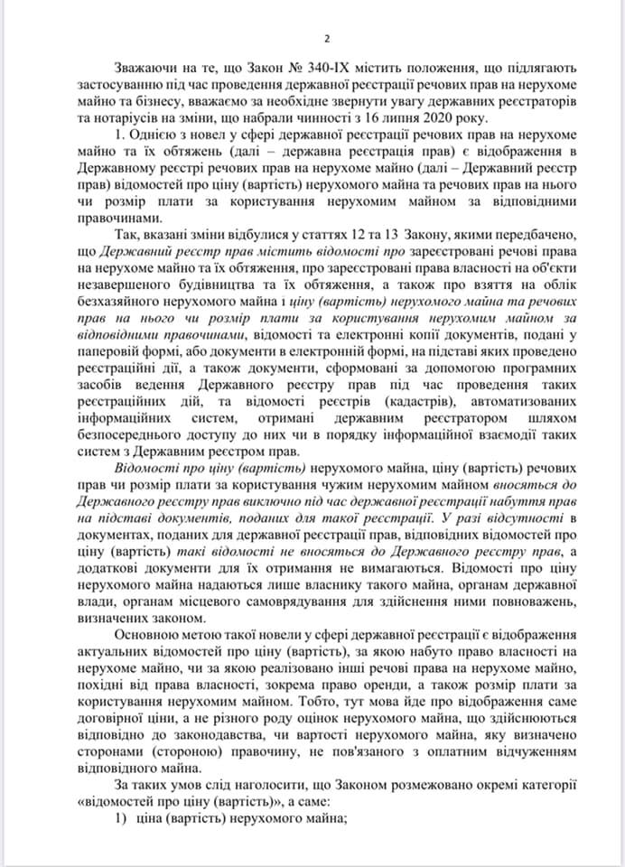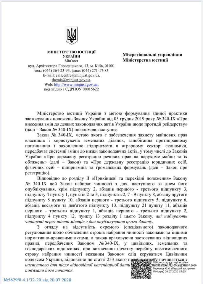 Лист Міністерства юстиції України від 20.07.2020 №5829/8.4.1/32-20 щодо новел в законодавстві України у сферах державної реєстрації речових прав та бізнесу , які набрали чинності 16.07.2020