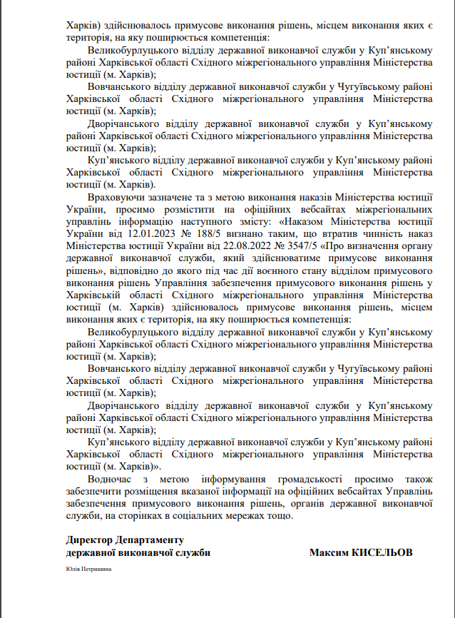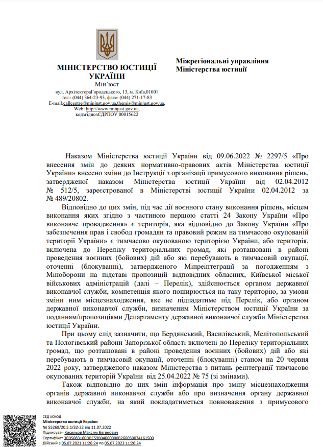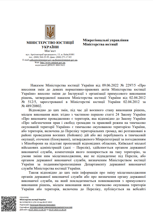 На виконання листа директора Департаменту державної виконавчої служби Міністерства юстиції України Кисельова М.Є. № 57225/20.5.1/32-22 від 14.07.2022 щодо розміщення інформації про те, що під час дії воєнного стану примусове виконання рішень, місцем виконання яких є Автономна Республіка Крим та місто Севастополь здійснює відділ примусового виконання рішень Управління забезпечення примусового виконання рішень у Кіровоградській області Південно-Східного міжрегіонального управління Міністерства юстиції (м.Дніпро)