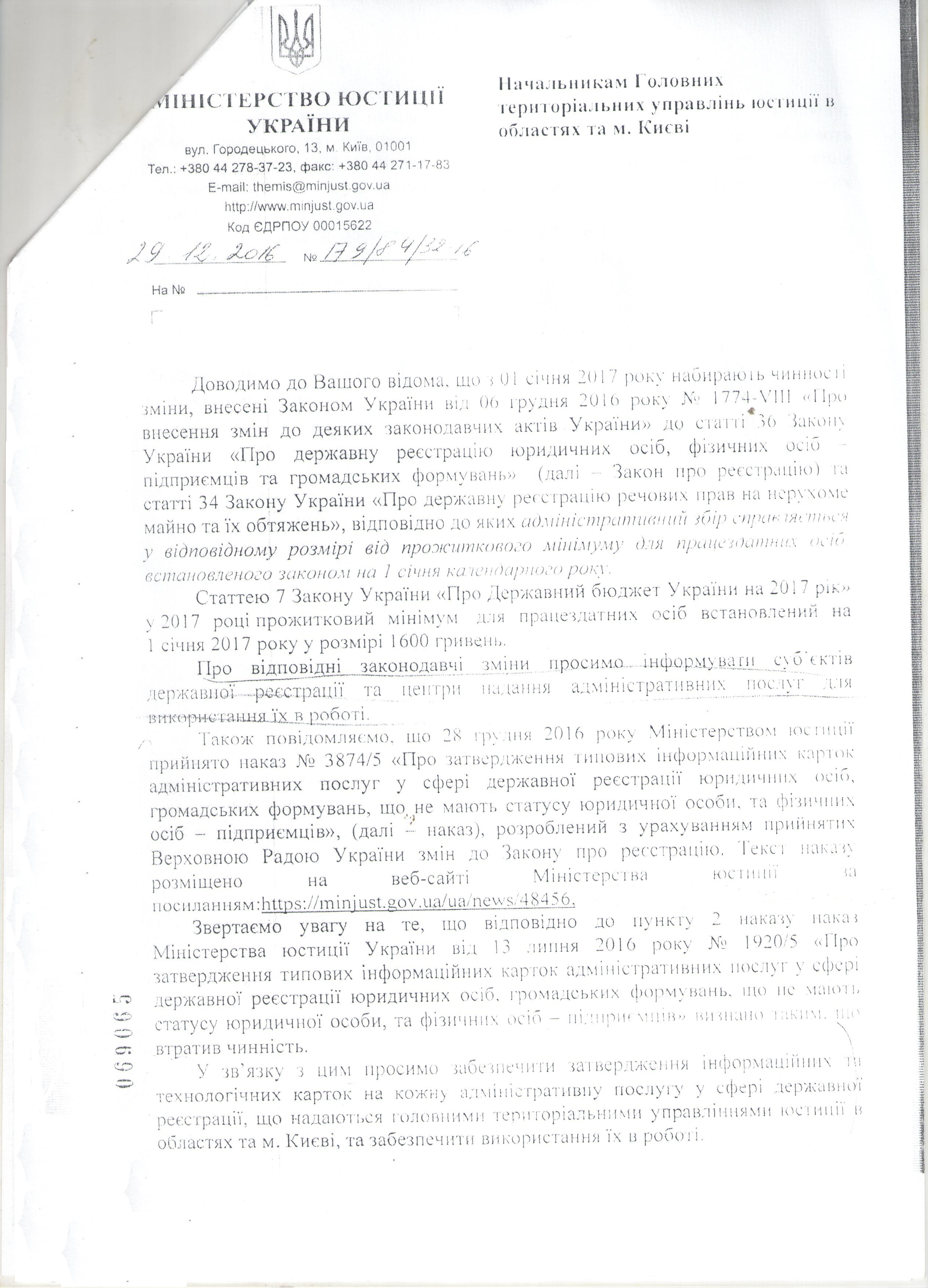 Лист Міністерства юстиції України від 29.12.2016 № 179/8.4/32-16 щодо законодавчих змін у сфері державної реєстрації, відповідно до яких адміністративний збір справляється у відповідному розмірі від прожиткового мінімуму для працездатних осіб