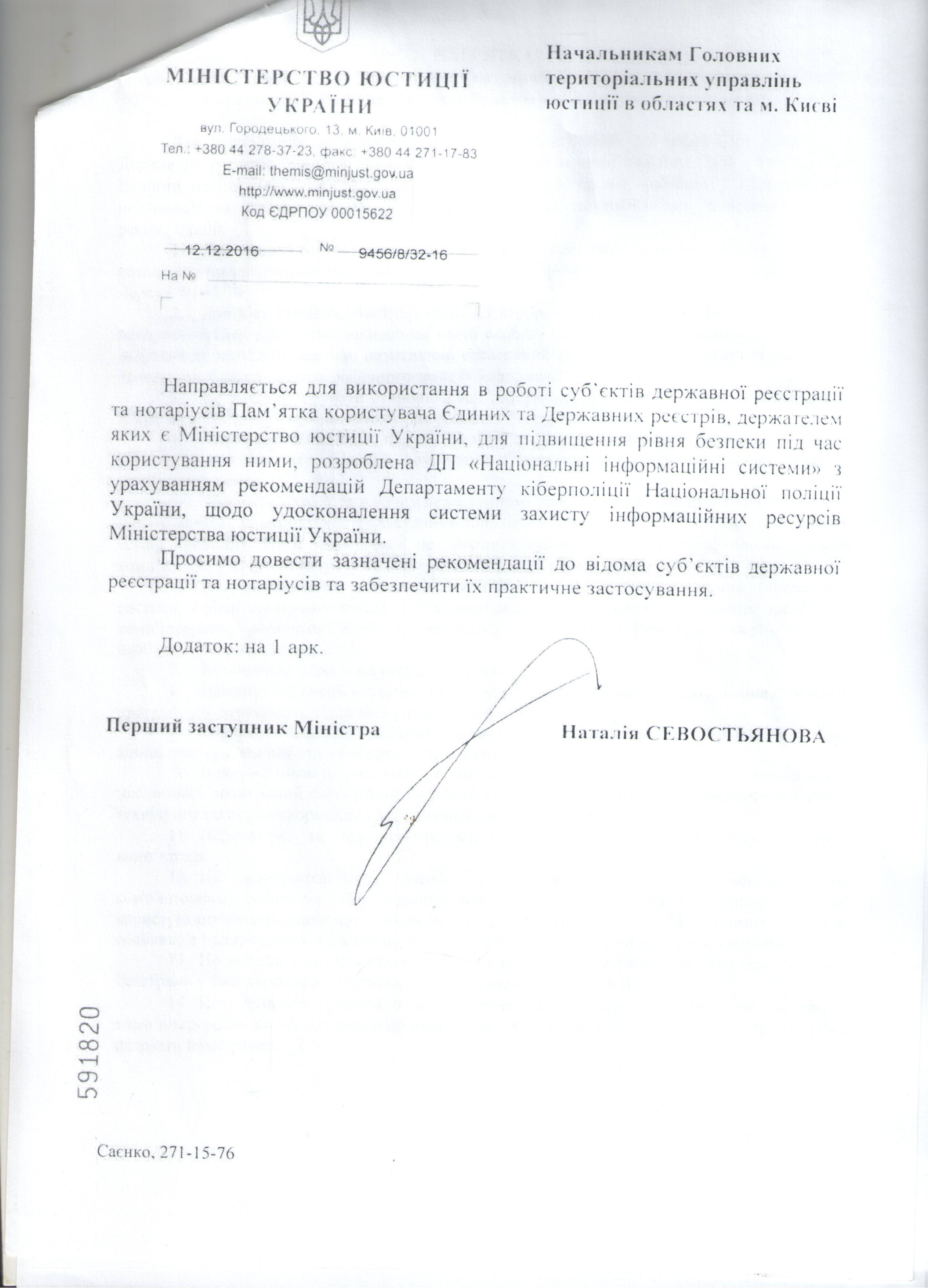 Лист Міністерства юстиції України від 12.12.2016 № 9456/8/32-16 щодо використання в роботі суб’єктів державної реєстрації та нотаріусів Пам’ятки користувача Єдиних та Державних реєстрів, держателем яких є Міністерство юстиції України