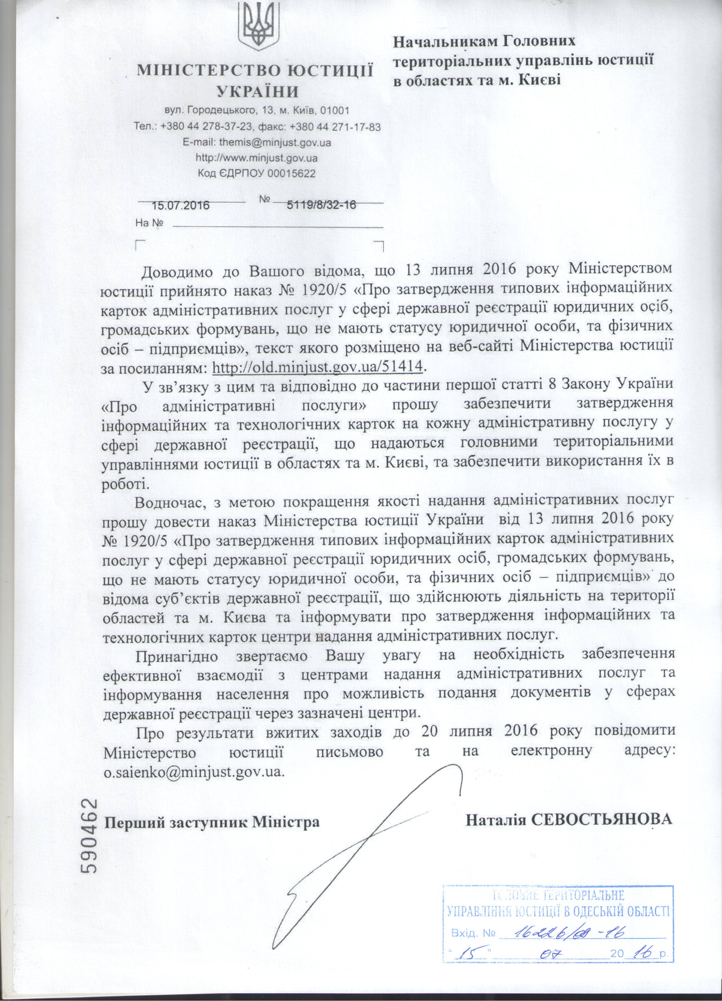 Лист Міністерства юстиції України від 15.07.2016 № 5119/8/32-16 щодо забезпечення затвердження типових інформаційних карток на кожну адміністративну послугу у сфері державної реєстрації