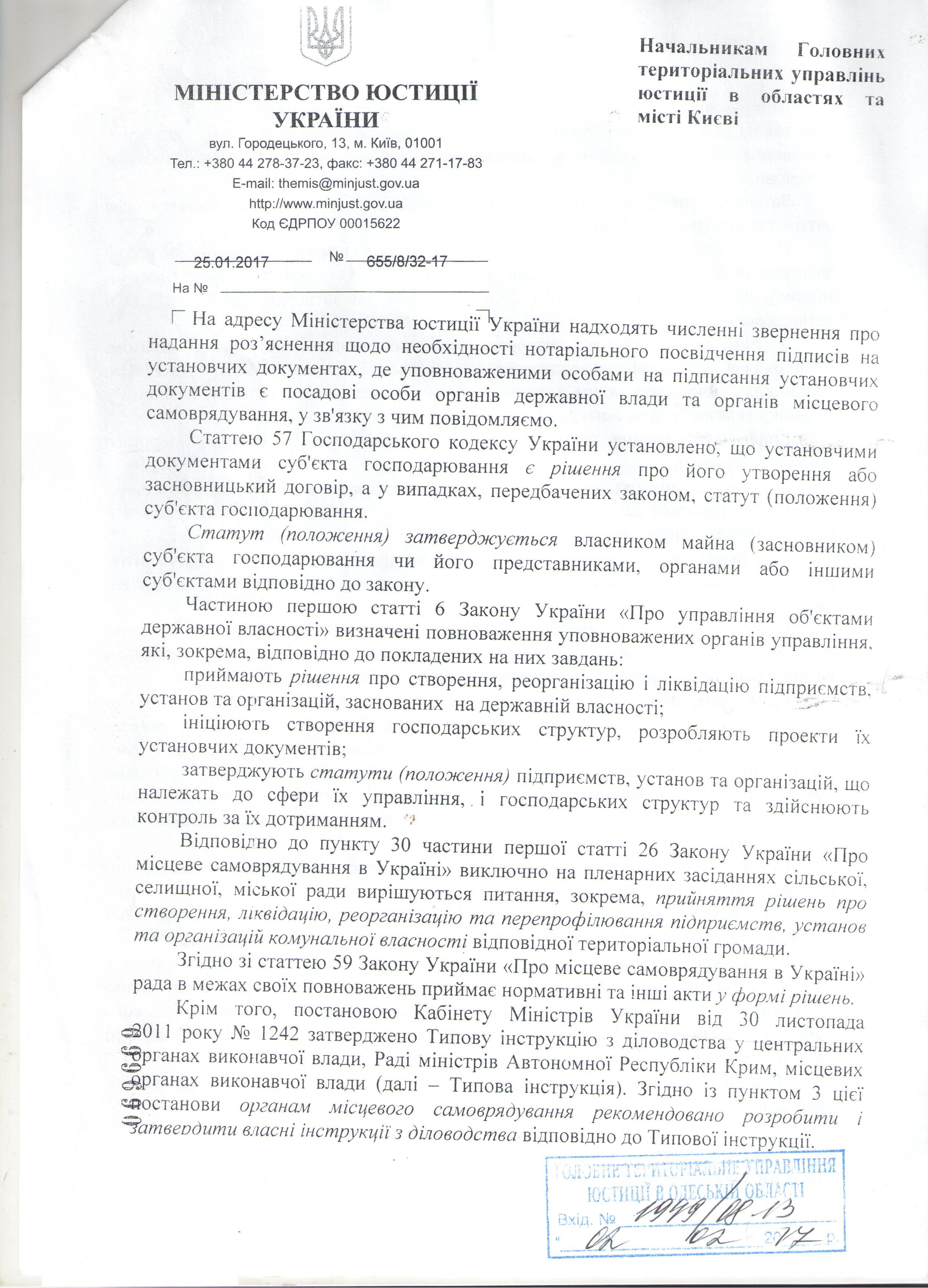 Лист Міністерства юстиції України від 25.01.2017 № 655/8/32-17 щодо необхідності нотаріального посвідчення підписів на установчих документах