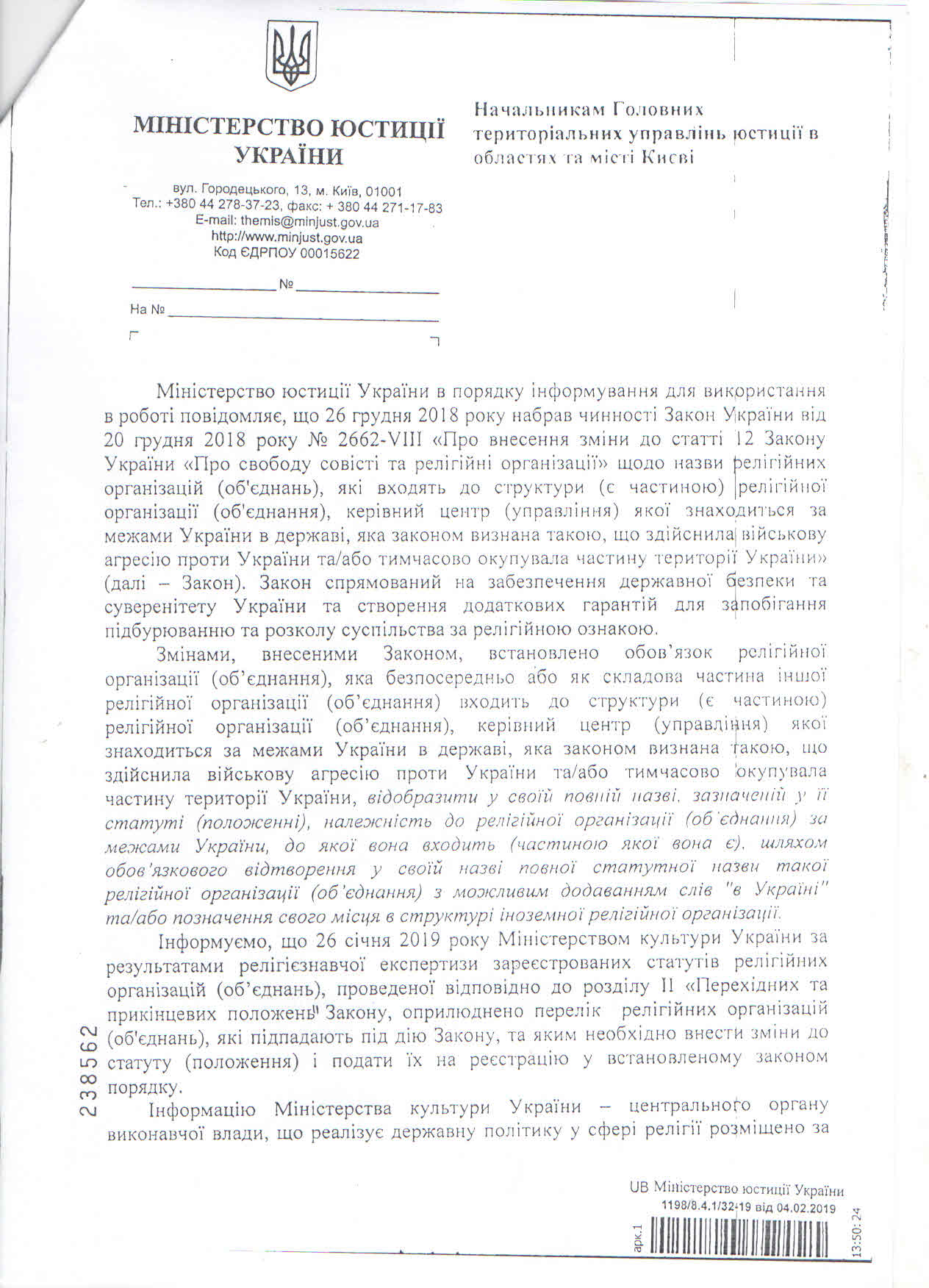 Лист Міністерства юстиції України щодо набрання чинності Закону України «Про внесення зміни до ст.12 Закону України «Про свободу совісті та релігійні організації
